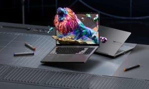 الكمبيوتر المحمول Vivobook Pro من Asus مزود بشاشة ثلاثية الأبعادOLED مقاس 16 بوصة، ويعمل باستخدام نظام كاميرا لتتبع العين. بالإضافة إلى عدسة مدمجة في الشاشة.
