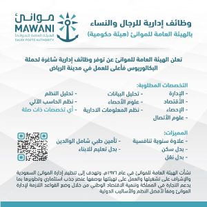 أعلنت الهيئة العامة للموانئ عن توفر وظائف إدارية شاغرة لحملة البكالوريوس فأعلى للعمل في مدينة الرياض.