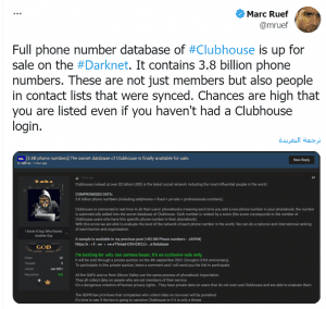ونبه “ريف” إلى أن هذه القائمة لا تشمل أرقام مستخدمي كلوب هاوس فقط بل أيضًا أرقام أشخاص تمت مزامنة معلوماتهم من قوائم جهات اتصال مستخدمي التطبيق؛ ما يعني أن الجميع مدرج فى قائمة الأرقام المباعة حتى غير المشتركين في التطبيق.