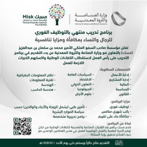 أعلنت مؤسسة، صاحب السمو الملكي الأمير محمد بن سلمان بن عبدالعزيز ولي العهد رئيس مجلس الوزراء، “مسك” بالتعاون مع وزارة الصناعة والثروة المعدنية، عن بدء التقديم في برنامج التدريب على رأس العمل لاستقطاب الكفاءات الوطنية وإكسابهم الخبرات اللازمة للعمل.