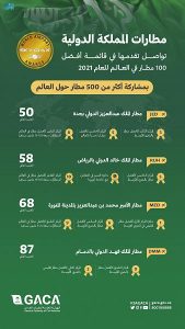 واصلت مطارات المملكة الدولية للعام الثاني على التوالي رغم ظروف جائحة كورونا تقدمها ضمن قائمة أفضل 100 مطار في العالم .