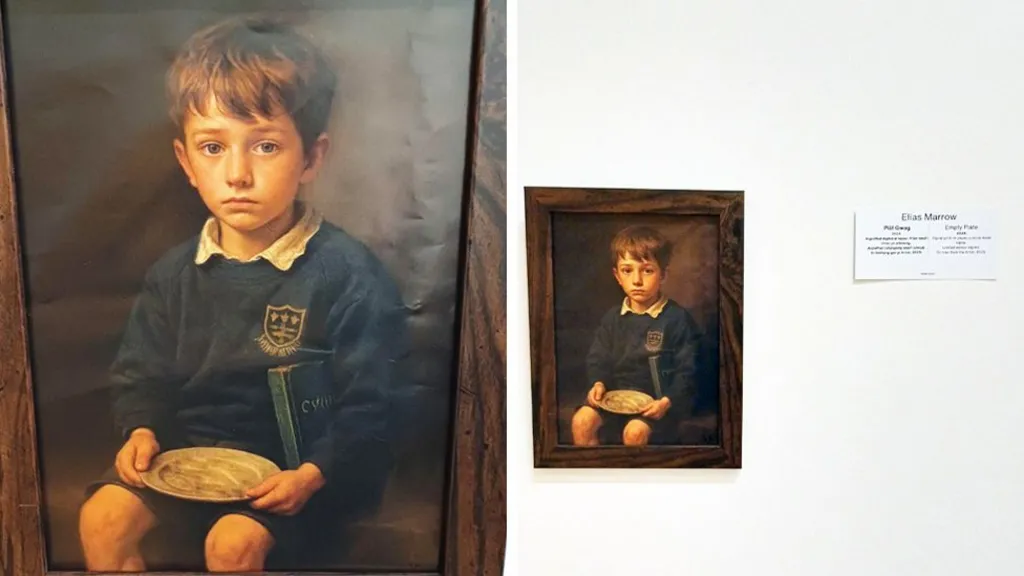 في حين أطلق على هذه اللوحة اسم “الطبق الفارغ”، حيث تصوّر صبيًا صغيرًا يرتدي زيًا مدرسيًا ويحمل طبقًا فارغًا. بينما علق Marrow أن “الطبق الفارغ” “يمثل ويلز في عام ٢٠٢٥”.