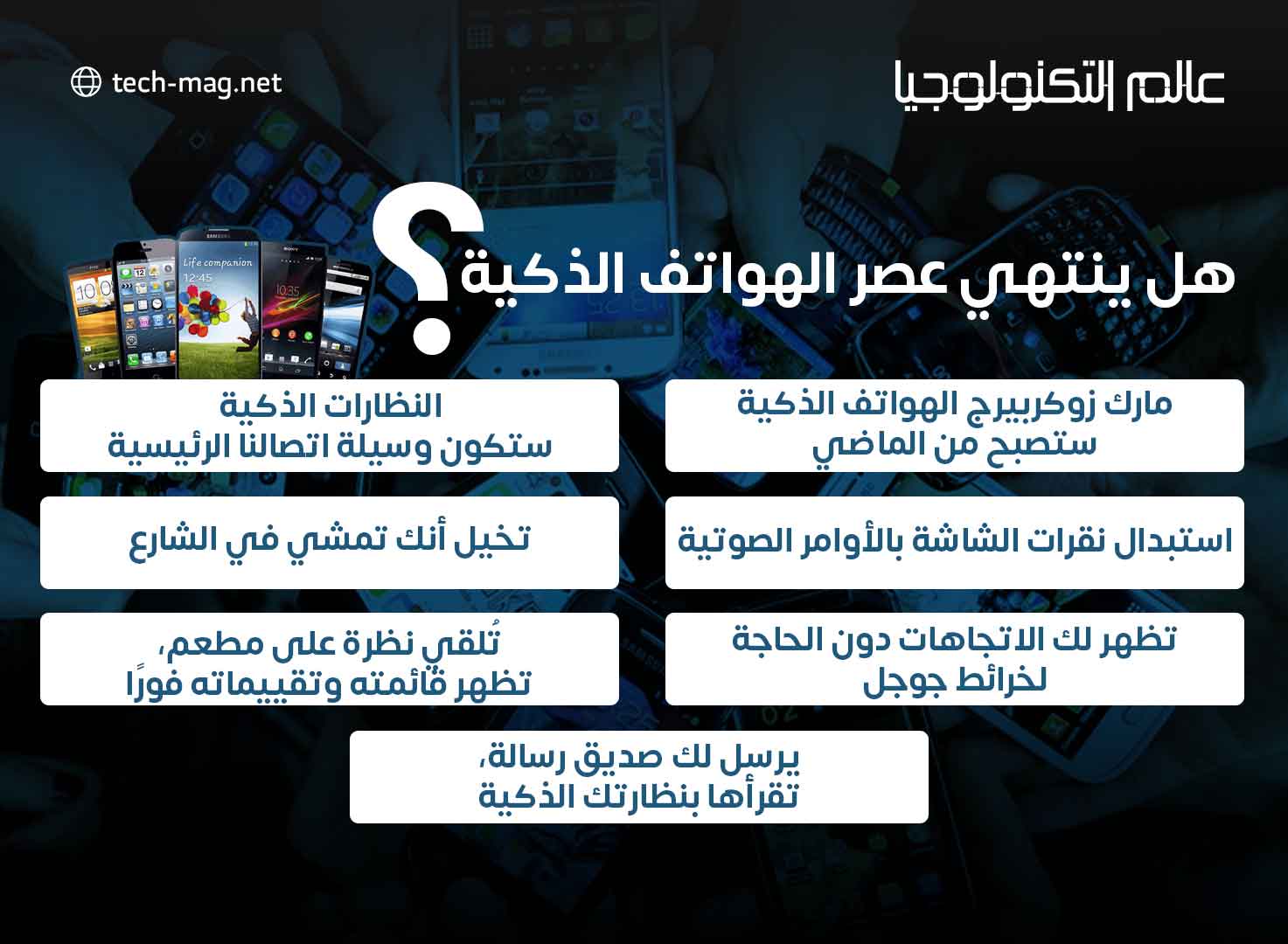 لمدة ثلاثة عقود تقريبًا سيطرت الهواتف الذكية على حياة البشر. وإذا كان مارك زوكربيرج محقًا فإن عصرها يوشك على الانتهاء. بسبب تقنية جديدة آخذة في الظهور، تَعِد باستبدال الهواتف المحمولة وإحداث ثورة في كيفية تفاعلنا مع العالم الرقمي.