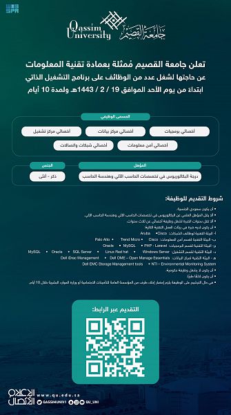 أعلنت جامعة القصيم، مُمثلة بعمادة تقنية المعلومات عن حاجتها لشغل عدد ...